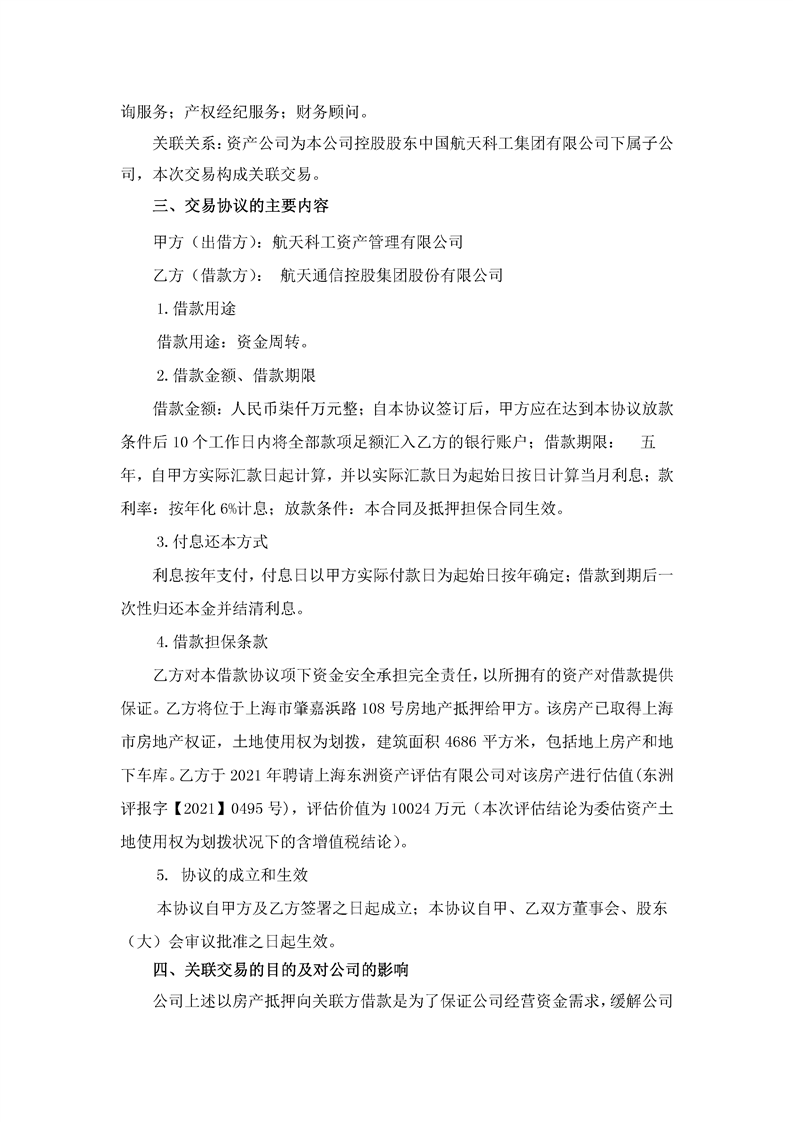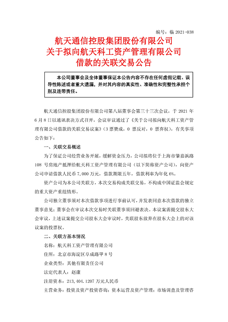 航天通信控股集團股份有限公司關于擬向航天科工資產管理有限公司借款的關聯交易公告